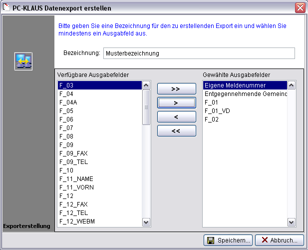 Geben Sie eine verbale leicht verständliche Bezeichnung des zu erstellenden Exports ein. Wählen Sie die Ausgabefelder aus der Tabelle Verfügbare Ausgabefelder per Doppelklick oder über die Schalter, welche sich in der Mitte der beiden Tabellen befinden.