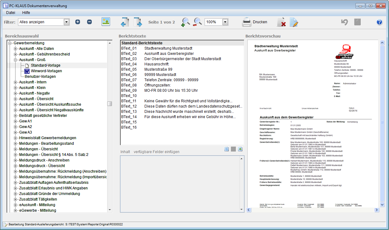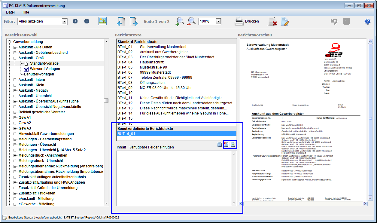 Nach dem Start der Dokumentenverwaltung wählen Sie bitte im linken Bereich unter Bereichsauswahl den Programmteil und den gewünschten Bericht zur Anpassung der Berichtstexte aus. In der nachfolgenden Abbildung haben wir den Programmteil Gewerbemeldung und den Bericht Auskunft - Groß gewählt.