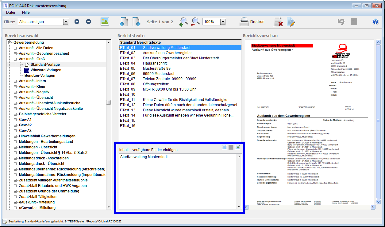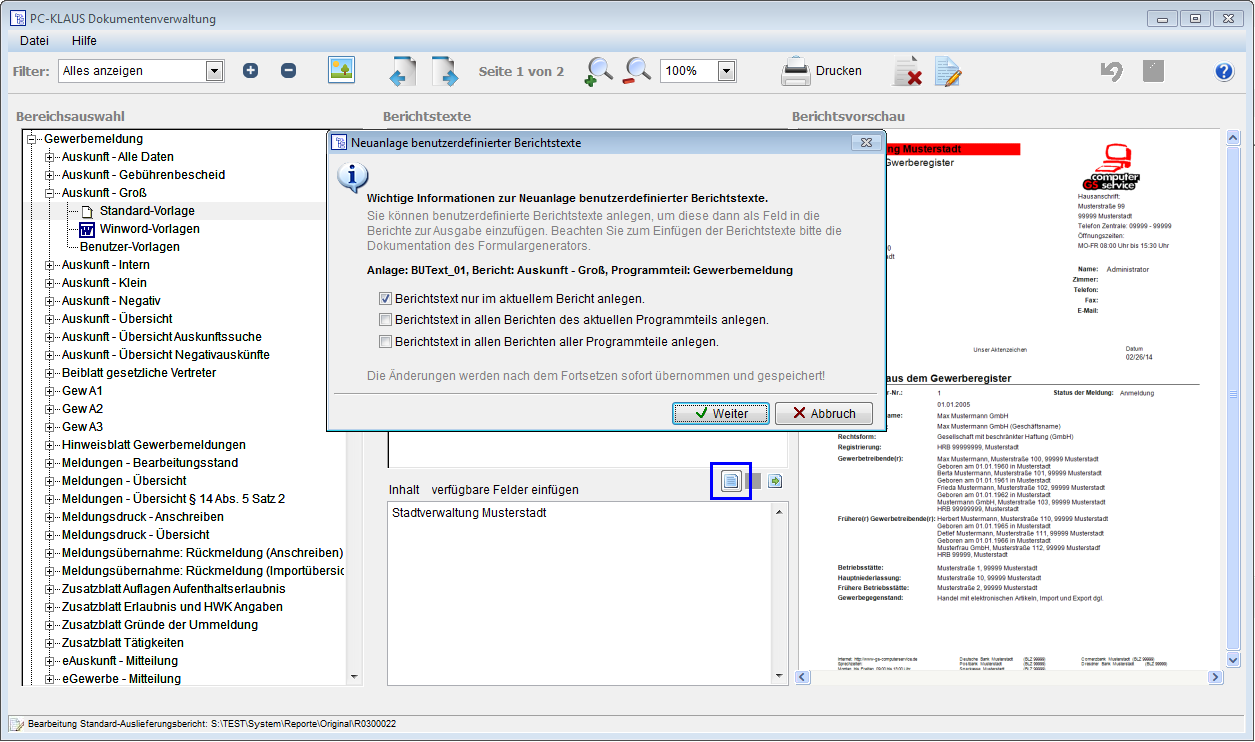 Geben Sie die Berichtstexte für einen Bericht ein und prüfen Sie in der Vorschau, ob die Eingaben Ihren Erwartungen entsprechen. Wir empfehlen die Große Auskunft zu nutzen, da dort alle Berichtstextfelder enthalten sind.