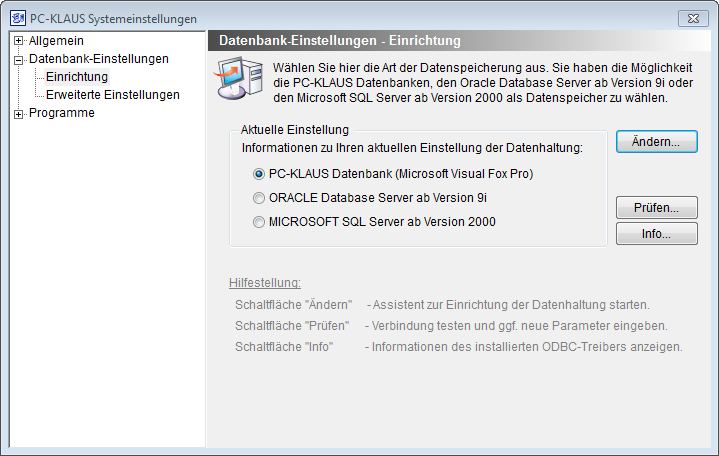 Wählen Sie anschließend in der linken Auflistung den Eintrag [Einrichtung] im Bereich [Datenbank-Einstellungen]. Zum Umstellen der aktuellen Datenhaltung betätigen Sie die Schaltfläche [Ändern]. Es wird der Assistent zur Datenhaltung ausgeführt, welcher Sie durch die einzelnen Teilschritte leitet. Folgen Sie den Anweisungen des Assistenten.