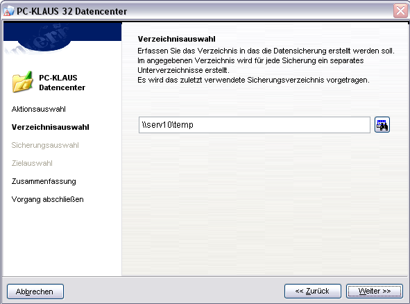 Um die Datensicherung auszuführen, betätigen Sie die Schaltfläche [Weiter]. Je nach Datenhaltung und Datenumfang kann die Sicherung einige Zeit in Anspruch nehmen. Wenn Sie Ihren Sicherungspfad ändern möchten betätigen Sie die Schaltfläche [Weiter], Ihnen wird nun die nachfolgende Maske angezeigt.