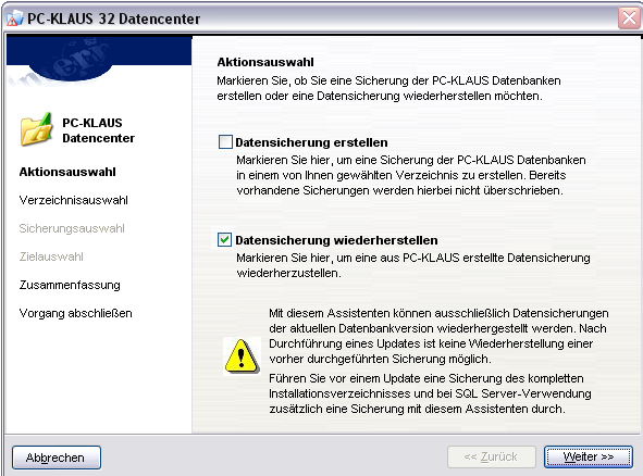 Mit diesem Assistenten können ausschließlich Datensicherungen der aktuellen Datenbankversion wiederhergestellt werden. Nach Durchführung eines Updates ist keine Wiederherstellung einer vorher durchgeführten Sicherung möglich. Führen Sie vor einem Update eine Sicherung des kompletten Installationsverzeichnisses und bei SQL- Server Verwendung zusätzlich eine Sicherung mit diesem Assistenten durch.
