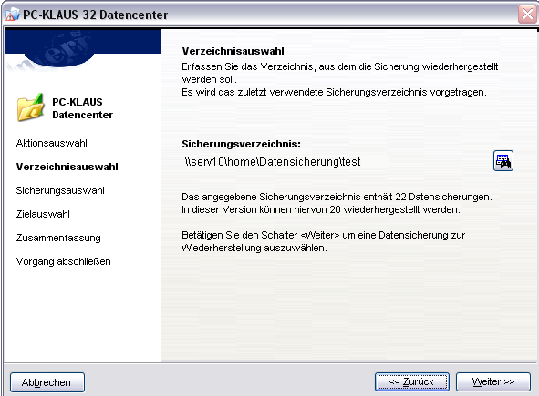 Erfassen Sie das Verzeichnis, aus dem die Sicherung wiederhergestellt werden soll. Das zuletzt verwendete Sicherungsverzeichnis wird vorgetragen. Betätigen Sie den Schalter [Weiter >>] um eine Datensicherung zur Wiederherstellung auszuwählen.