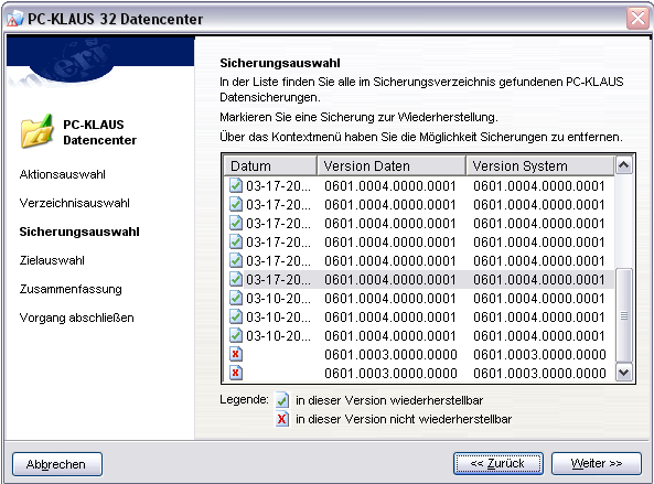 In dieser Liste finden Sie alle im Sicherungsverzeichnis gefundenen PC KLAUS Datensicherungen. Zum Wiederherstellen markieren sie eine Sicherung. Mit einem rechts Klick auf eine Sicherung wird das Kontextmenü aufgerufen, dort haben Sie die Möglichkeit Sicherungen zu entfernen. Die Sicherungsversionen, die mit einem grünen Haken versehen sind können wiederhergestellt werden. Die mit einem roten Kreuz können in dieser PC KLAUS Version nicht wiederhergestellt werden.