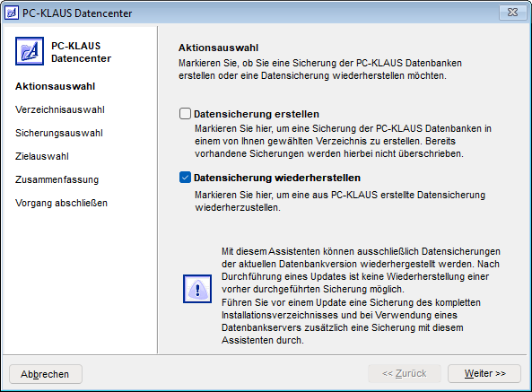 Die Funktion zum Sichern und Wiederherstellen der PC-KLAUS Datenbank ist an Berechtigungen innerhalb der Software gebunden.