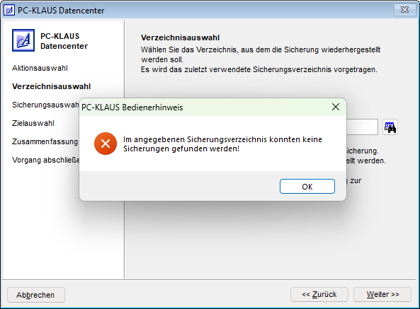 Wenn PC-KLAUS keine passenden Daten in dem von Ihnen angegebenen Verzeichnis findet, erhalten Sie folgenden Hinweis: