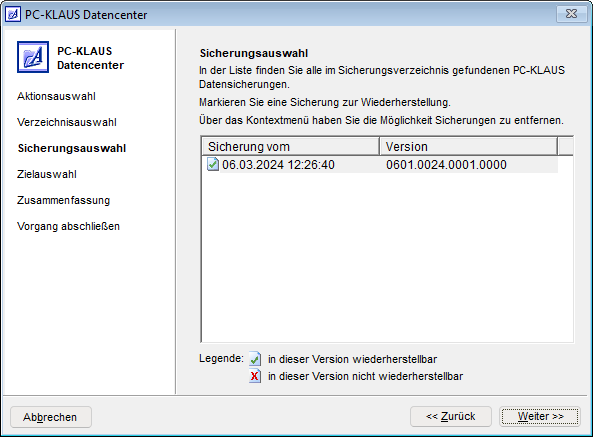 Wenn innerhalb des angegebenen Verzeichnisses also mehrere PC-KLAUS Sicherungen abgelegt sind, entscheiden Sie hier, welche davon nun wiederhergestellt werden soll.