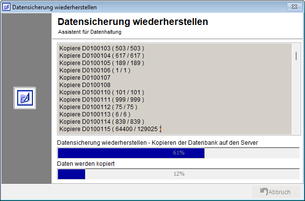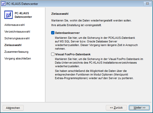 Alternativ kann man hier auch die PC-KLAUS Datenbank (Visual FoxPro Datenbank) verwenden und erst im Anschluss an die Wiederherstellung die Daten auf einen Microsoft SQL oder Oracle Datenbankserver auslagern.