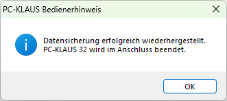 Nachdem die Wiederherstellung erfolgreich abgeschlossen wurde, beendet sich PC-KLAUS mit einem Klick auf [OK].