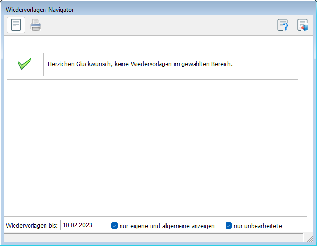 Damit öffnet sich der Wiedervorlagen-Navigator. Eine Maske, in der Ihnen alle aktuellen Wiedervorlagen angezeigt werden, Sie neue Wiedervorlagen erstellen, löschen oder auch einem anderen Benutzer zuweisen können.