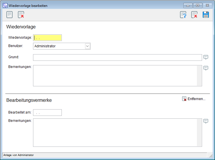 In der folgenden Maske, befüllen Sie nun die Eingabefelder. Sowohl der Grund, als auch die Bemerkung der Wiedervorlage sind Freitextfelder.