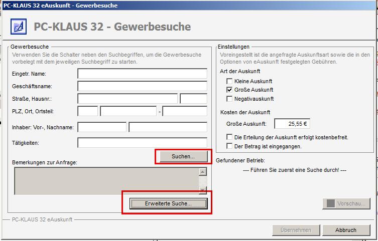 Nach dem betätigen der Schaltfläche wird Ihnen das folgende Formular zur Suche angezeigt. In diesem Formular werden die Angaben des Betriebes, die der Auskunftsanfragende Online eingegeben hat vorgetragen: