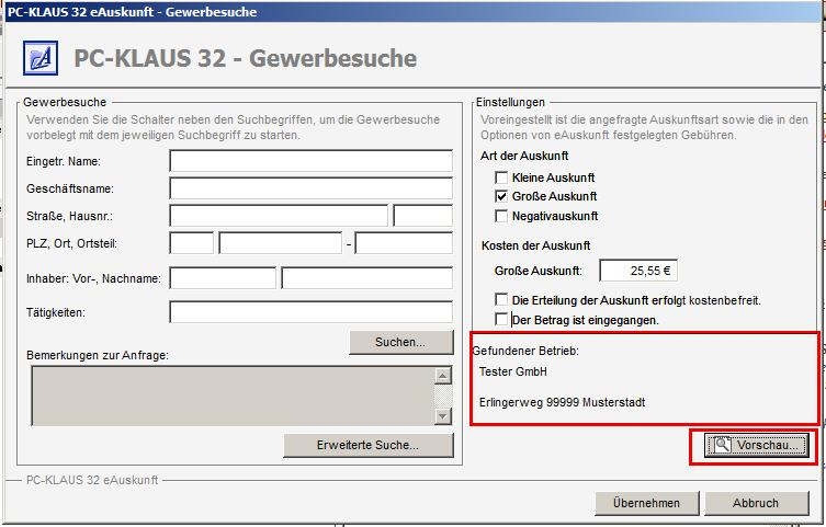 Nutzen Sie nun eine der beiden Schaltflächen, um den angefragten Betreib, sofern vorhanden, aus Ihrem Datenbestand zu übernehmen. Nach der Übenahme wird Ihnen der Betrieb angezeigt und Sie können bei Bedarf die Vorschau anzeigen: