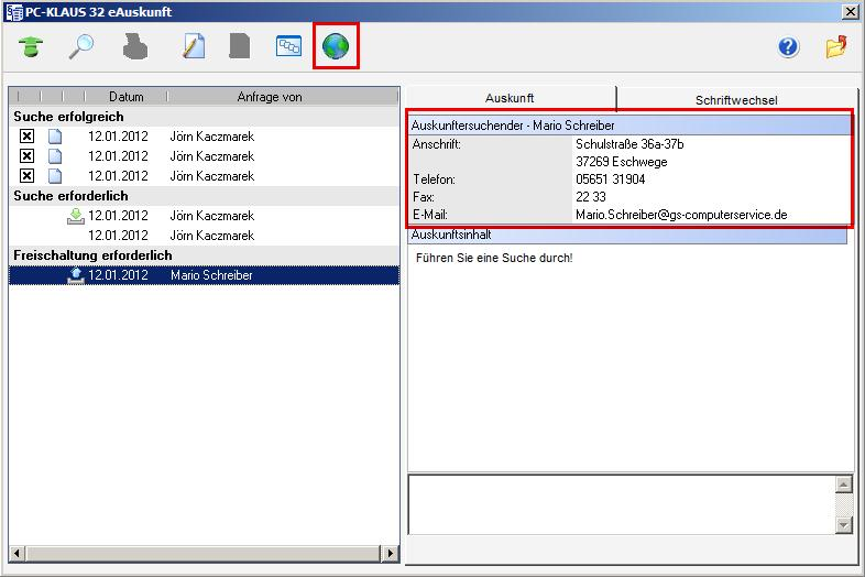 In diesem Bereich sind die Auskunftsersuchenden dargestellt, die eine Auskunft gestell haben, die Sie aber noch nicht zugelassen haben. Wählen Sie die markierte Schaltfläche aus der Toolbar, um diesen Anfragenden die Berechtigung zu erteilen.