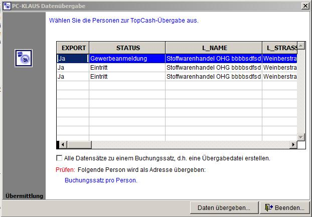 Wählen Sie nun bei Bedarf die Daten und Optionen aus die Sie benötigen. Übergeben SIe die Daten, in dem Sie die Schaltfläche [Daten übergeben] betätigen. Starten Sie dann Ihr TopCash Verfahren und importieren Sie die Daten.