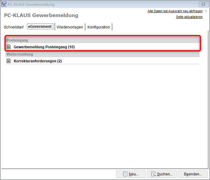 Sobald elektronische Gewerbemeldungen von dem PCK-Communicator für den Import bereit gestellt wurden, finden Sie diese im Posteingang der Gewerbemeldung.