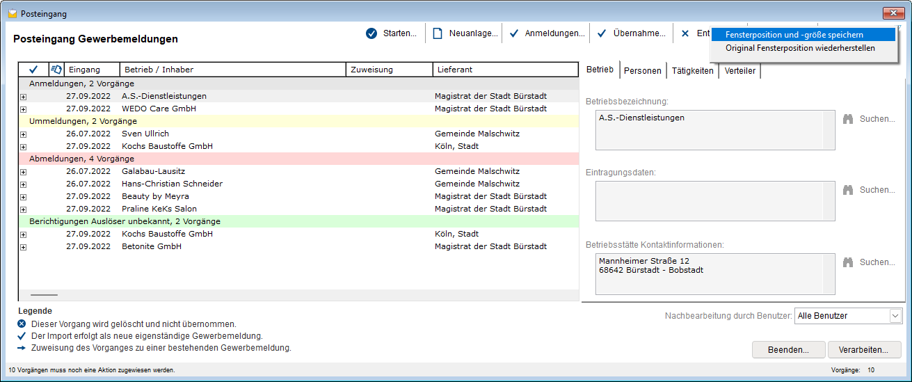 Mit Klick auf einen der Datensätze, werden auf der rechten Seite die Daten aus der angelieferten, elektronischen Gewerbemeldung angezeigt.