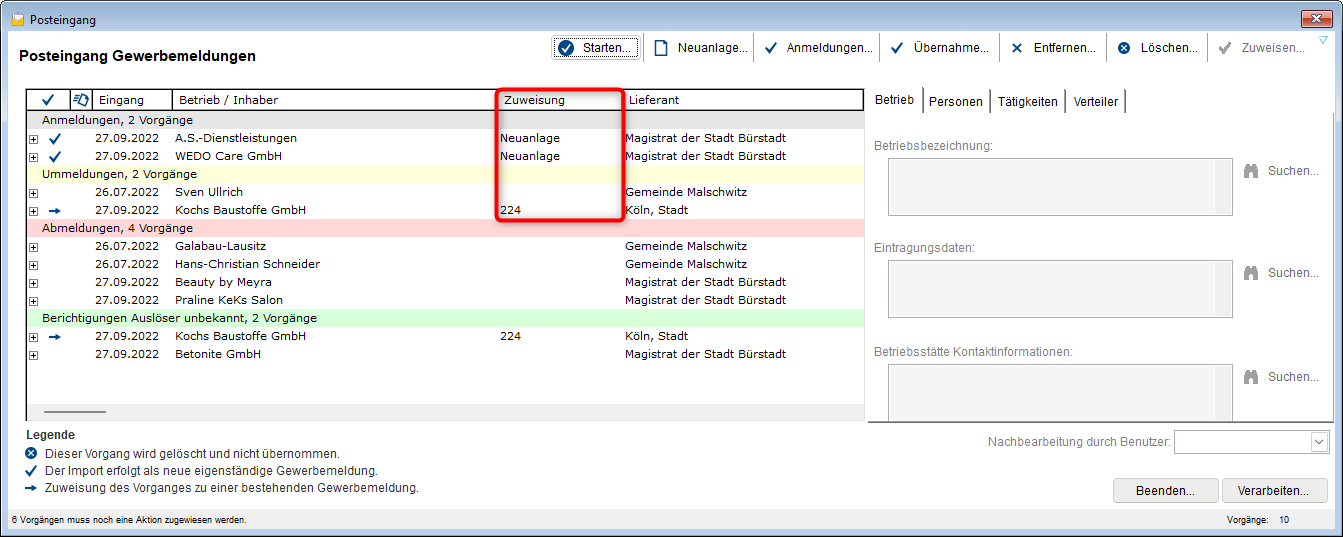 Mit der Schaltfläche "Übernahme" werden alle Fälle, die keine automatische Zuweisung bekommen haben automatisch als Neuanlage gekennzeichnet.