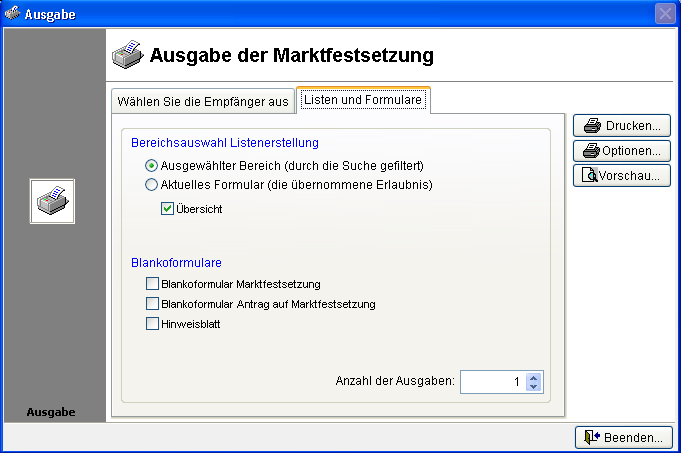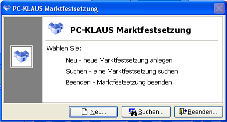 Starten Sie das Modul Marktfestsetzung im Hauptmenü über den Menüpunkt [Erlaubnisse] [Marktfestsetzung]. Folgendes Formular wird Ihnen zur weiteren Auswahl angezeigt:
