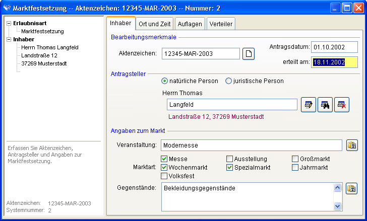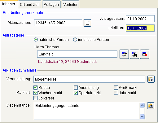 Die für das Aktenzeichen vergebene Nummer kann im Modul Option konfiguriert werden. Erfassen Sie das Antragsdatum. Sie können wie bei jeder Datumserfassung einen [Doppelklick] verwenden, um das aktuelle Datum zu übernehmen oder mit der [rechten Maustaste] das Datum aus einem Kalender auswählen. Erfassen Sie den Antragsteller. Beachten Sie dazu bitte das Kapitel Adresserfassung. Erfassen Sie die Bezeichnung der Veranstaltung, markieren Sie die Marktart und unter Gegenstände die angebotenen Leistungen und Waren.