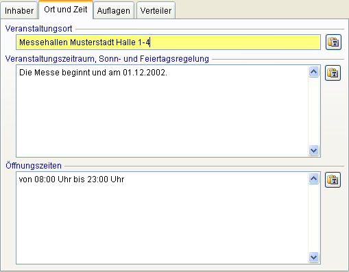 Erfassen Sie Veranstaltungsort, Veranstaltungszeitraum inkl. Sonn- und Feiertagsregelung und die Öffnungszeiten der Veranstaltung.