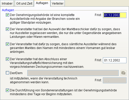 Markieren Sie die benötigten Auflagen. Die zugehörigen Felder werden aktiv, wenn Sie die Auflage markieren.