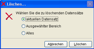 Wählen Sie, ob Sie den im Hintergrund angezeigten aktuellen Datensatz, alle Datensätze innerhalb des durch die letzte Suche ausgewählten Bereich, oder alle erfassten Datensätze löschen möchten.