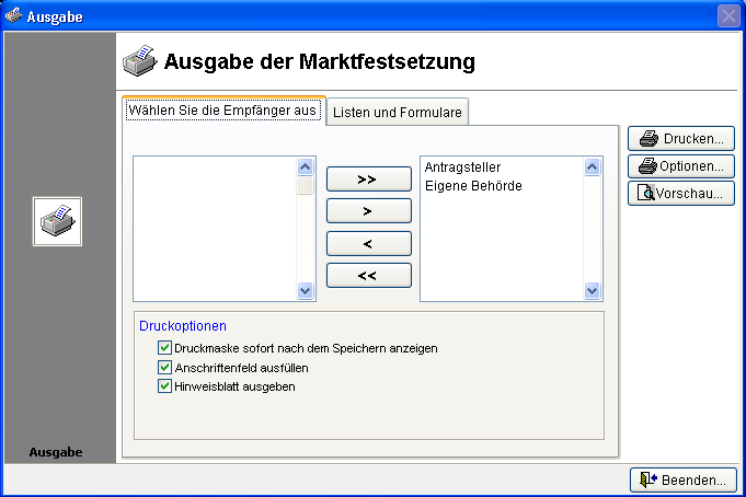 Wählen Sie einen oder alle Empfänger für die gedruckt werden soll aus. Links befinden sich nicht gewählte Empfänger, rechts die für den Druck gewählten Empfänger. Die angezeigten Empfänger entsprechen dem bei der Erfassung des Datensatzes zugewiesenen Empfänger. Welche der Empfänger direkt nach dem Start des Druckformulars bereits gewählt sein sollen, kann im Modul Allgemeine Adressen konfiguriert werden. Das Modul kann über den Menüpunkt [Stammdaten] [Allgemeine Adressen] im Hauptmenü gestartet werden.