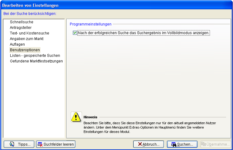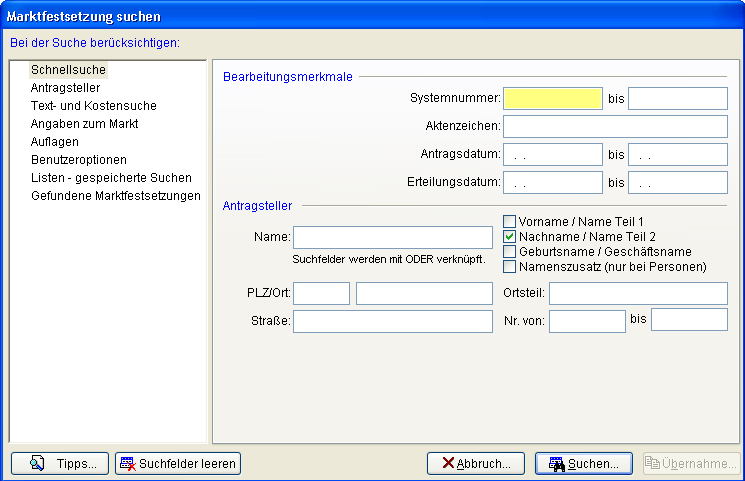 PC-KLAUS hat es sich zur Aufgabe gemacht, dass Sie nach allen Eingabekriterien und allen Kombinationen Ihre Suchen durchführen können. Sogar das Speichern immer wieder verwendeter Suchbedingungen, z.B. zur Ausgabe oder den Export in Listenform aller Erlaubnisse, wurde für Sie realisiert. Die Hauptseite die Ihnen nach dem Start des Formulars angezeigt wird ist die Schnellsuche. Hier haben wir die Suchbegriffe hinterlegt, die erfahrungsgemäß am häufigsten verwendet werden. Möchten Sie eine andere Standard-Suchseite beim Starten des Suchformulars, dann betätigen Sie bitte in der Auflistung der Suchbereiche die rechte Maustaste.