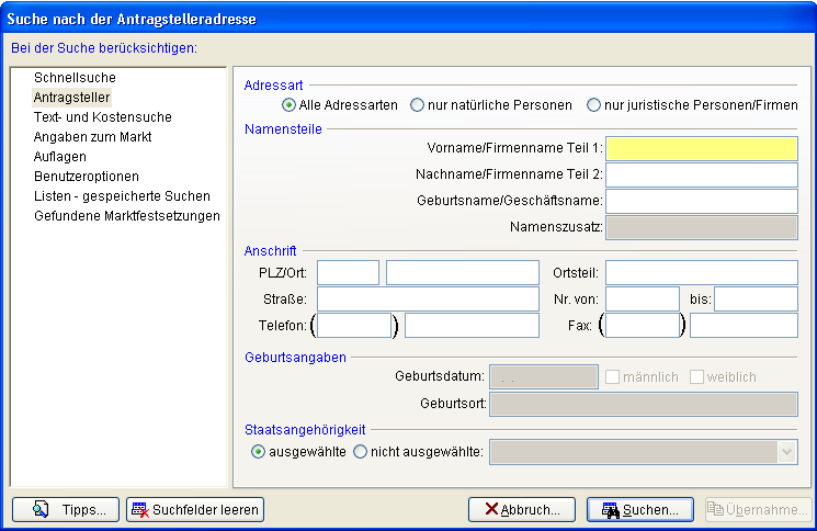 Auf der Seite Antragsteller können Sie nach Detailangaben der Antragsteller-Adresse suchen. Die Bereiche Geburtsangaben und Staatsangehörigkeit werden nur dann aktiv, wenn unter Adressart die Option nur natürliche Personen gewählt wird.