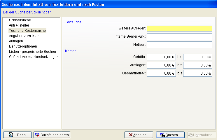 Im Abschnitt Textsuche können Sie innerhalb der Fließtextfelder Auflagen, interne Bemerkung und Notizen suchen, im Abschnitt Kosten nach den Gebühr, Auslagen und Gesamtbetrag einer Erlaubnis oder Bestätigung.
