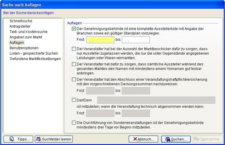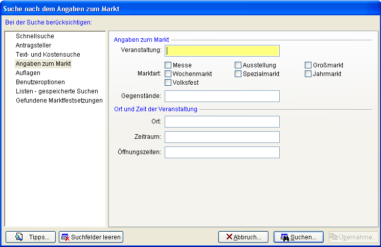 Im Abschnitt Angaben zum Markt können Sie nach der Bezeichnung der Veranstaltung, nach den Marktarten und nach angebotenen Gegenständen suchen. Im Abschnitt Ort und Zeit der Veranstaltung können Sie nach dem Ort der Veranstaltung, dem Zeitraum inkl. Sonn und Feiertagsregelung und den Öffnungszeiten suchen.