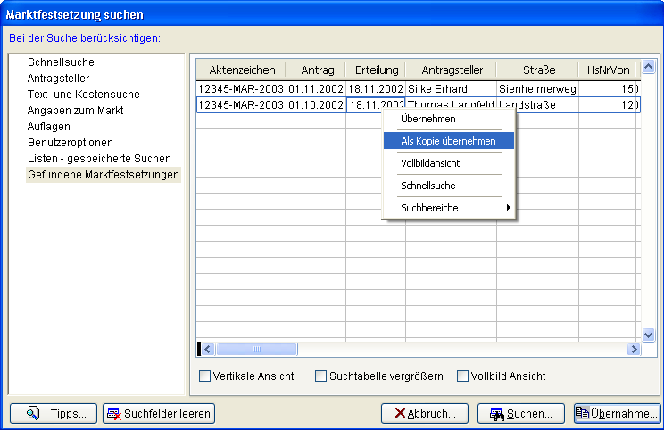 durch Markieren des gewünschten Datensatzes und bestätigen der Taste [Übernahme...] oder über das Kontextmenü [rechte Maustaste] [Übernehmen] können Sie einen Datensatz aus dem Suchergebnis übernehmen. Über das Kontextmenü haben Sie auch die Möglichkeit einen Datensatz als Kopie zu übernehmen. Wählen Sie hierzu den Eintrag [Als Kopie übernehmen].