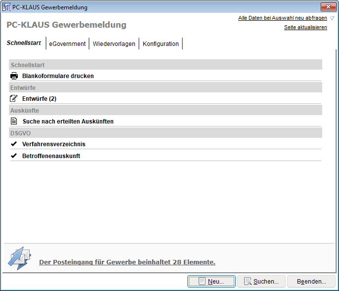 Im unteren Bereich des Registerblatts Schnellstart finden sie den Posteingang für Gewerbemeldungen. Die Handhabung des Posteingangs und Import von Gewerbemeldung ist in einem anderen Abschnitt dieses Artikels beschrieben.