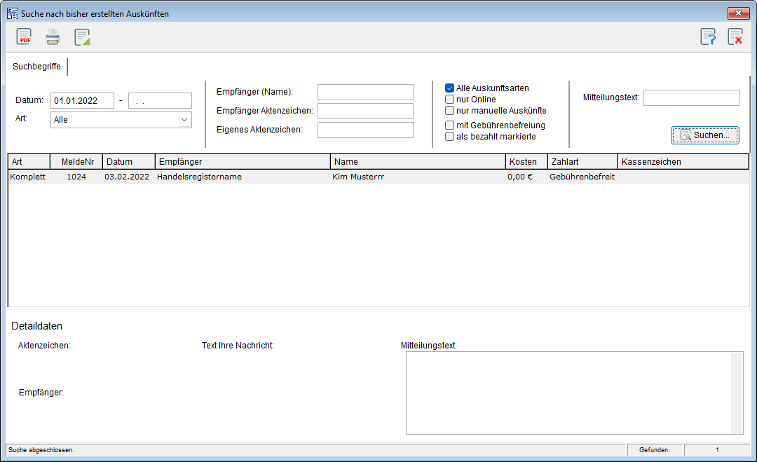 Wenn Sie in dieser Maske keine Suchkriterien eingeben und auf die Schaltfläche [Suchen] klicken, erhalten Sie im mittleren Bereich das entsprechende Suchergebnis als Liste. Diese beinhaltet ohne vorherige Suchkriterien alle Auskünfte, die PC-KLAUS jemals erstellt hat.