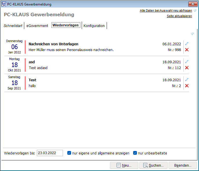 Auf diesem Registerblatt finden Sie die Wiedervorlagen, die zu einzelnen Gewerbemeldungen erstellt wurden und können diese direkt bearbeiten oder abschließen.
