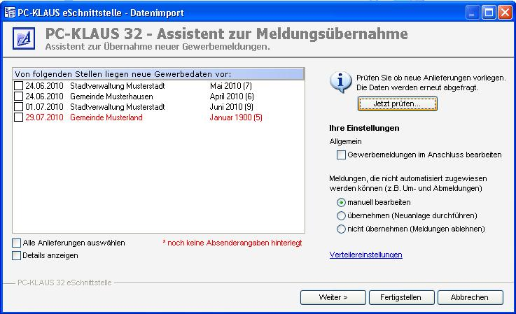 Legen Sie hier Ihre Verteilereinstellungen fest. Sie können bestimmen, welche Empfänger den neu übernommenen Meldungen zugewiesen werden. Stellen Sie sicher, dass alle gewünschten Einstellungen vorgenommen haben. Zur Übernahme einer Anlieferung markieren Sie diese. Klicken Sie anschließend auf die Schaltfläche „Weiter“. Zum direkten Durchführung des Imports ohne weitere Ansicht betätigen Sie die Schaltfläche „Fertigstellen“.