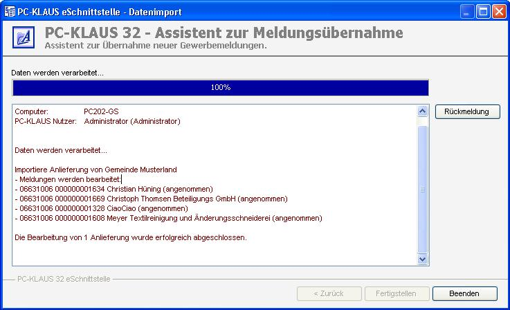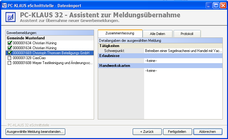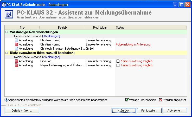 Zur Anzeige von Detailinformationen zu den einzelnen Meldungen, klicken Sie auf die Schaltfläche „Details prüfen“. Bitte beachten Sie: Sollten Sie beim Start des Assistenten die Einstellung „Details anzeigen“ gewählt haben, so wird Ihnen diese Schaltfläche nicht angezeigt. Die Details werden automatisch im nächsten Schritt durch Betätigen der Schaltfläche „Weiter“ angezeigt. Legen Sie jetzt Ihre gewünschte Vorgehensweise fest und klicken Sie auf die Schaltfläche „Fertigstellen“ um den Importvorgang durchzuführen. Die Daten werden jetzt in das Modul PC-KLAUS Gewerbemeldung übernommen.