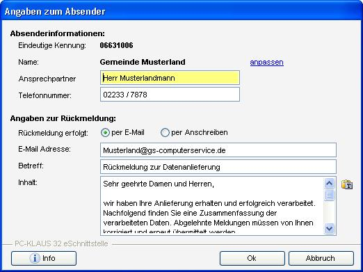 Mit Hilfe der rechten Maustaste auf eine im Importassistenten vorliegende Anlieferung haben Sie die Möglichkeit Absenderinformationen zu hinterlegen beziehungsweise diese zu bearbeiten. Dieser Schritt ist notwendig, damit PC-KLAUS 32 z.B. weiß, wie die Rückmeldung erfolgen soll. Je nach Art der Rückmeldung erfolgt diese per E-Mail oder per Anschreiben. Etwaige Vorbelegungen können hier festgelegt werden.