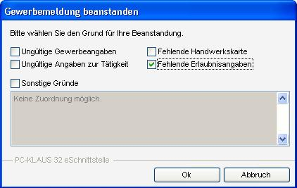 Durch Rechtsklick auf eine Meldung haben Sie stets die Möglichkeit diese zu beanstanden. Wenn Sie beispielsweise die Daten in der Detailansicht kontrollieren und feststellen, dass eine Erlaubnis zur Durchführung der gewerblichen Tätigkeit fehlt, dann markieren Sie das entsprechende Ankreuzfeld. Zur Eingabe von eigens formuliertem Text markieren Sie bitte „Sonstige Gründe“ und geben den Text Ihrer Beanstandung ein.