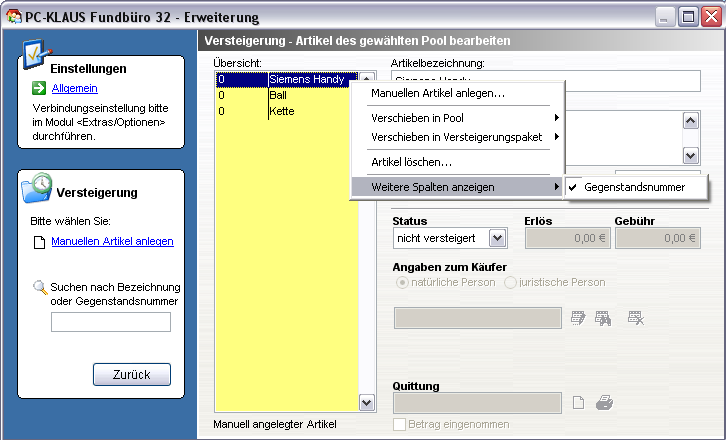 Um eine Versteigerung durchzuführen, brauchen Sie natürlich Artikel, die Sie zur Versteigerung einstellen möchten. Dabei handelt es sich in der Regel um offene Fundsachen, deren Aufbewahrungsfrist abgelaufen ist. Sie können aber auch Artikel manuell anlegen.