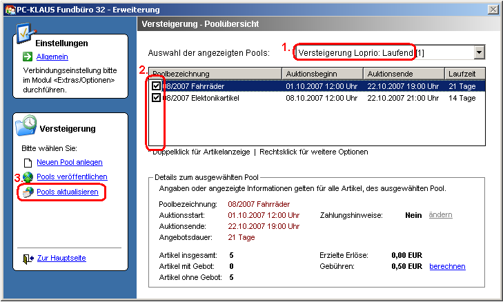 Wählen Sie in der Auflistung der laufenden Versteigerungspools die zu veröffentlichenden Pools durch [Markieren des linken Ankreuzfeldes] und klicken Sie anschließend auf die Schaltfläche [Pools aktualisieren].