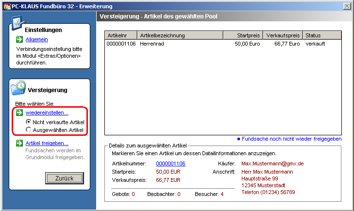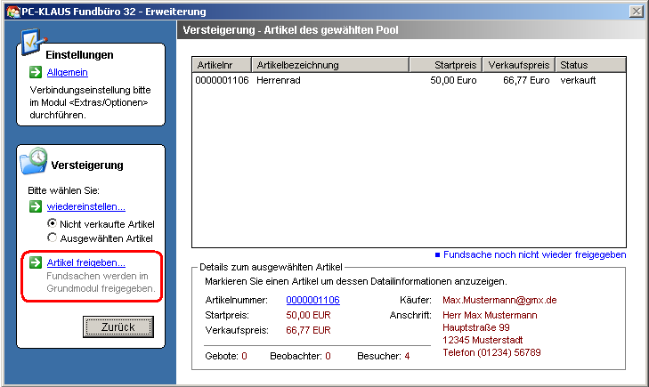Die Freigabe von Artikeln ist nur bei abgeschlossenen Auktionen möglich und nur bei Artikeln notwendig, die Sie aus dem PC-KLAUS Fundbüro Grundmodul eingelesen haben. Bei der Freigabe werden Informationen zum Ausgang der Versteigerung gespeichert. Damit ist im Grundmodul ersichtlich, ob und wenn ja für welchen Betrag ein Artikel versteigert wurde.