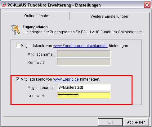 Markieren Sie im angezeigten Formular das Ankreuzfeld [Mitgliedskonto für www.Loprio.de hinterlegen]. Tragen Sie daraufhin Ihre Zugangsdaten ein, die Sie bei der Registrierung selbst gewählt haben.
