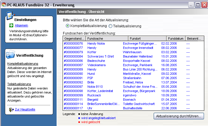 Wählen Sie diese Option, wenn Sie eine Teilaktualisierung durchführen möchten. Die Teilaktualisierung aktualisiert nur Ihre geänderten Daten. Neue Fundsachen werden angelegt, angepasste Fundsachen werden aktualisiert und entfernte Fundsachen werden im Internet gelöscht. Beachten Sie bei der Teilaktulisierung die angezeigte Legende zu den einzelnen Fundsachen.