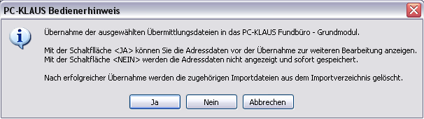 In der jetzt erscheinenden Bedienerabfrage können Sie wählen, ob Sie die Adressdaten des Finders bzw. des Verlierers zur weiteren Bearbeitung anzeigen möchten. Bei Auswahl der Schaltfläche [Nein] oder beim Speichern der Adressdaten bei vorheriger Auswahl der Schaltfläche [Ja] werden die jeweiligen Meldungen in das PC-KLAUS Fundbüro Grundmodul übernommen. Dort können die neuen Meldungen gezielt gesucht und weiter bearbeitet werden. Mehr Informationen zur Suche nach übernommenen Meldungen finden Sie im Abschnitt Schnellsuche im Handbuch Fundbüro.