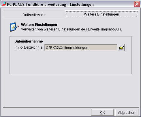 Um die Funktionalitäten der Datenübernahme nutzen zu können, müssen Sie das Verzeichnis auswählen, in dem neu empfangene Meldungen gespeichert werden. Zur Auswahl des Importverzeichnisses, klicken Sie in der linken Bereich Einstellungen auf die Schaltfläche [Allgemein] und wechseln Sie im angezeigten Formular auf die Registerseite [Weitere Einstellungen].