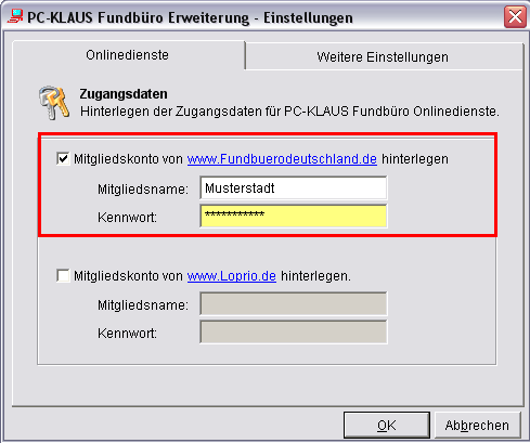 Markieren Sie im angezeigten Formular das Ankreuzfeld [Mitgliedskonto für www.Fundbuerodeutschland.de hinterlegen]. Tragen Sie daraufhin Ihre Zugangsdaten ein, die Sie nach der Registrierung erhalten haben. Ihre Veröffentlichungsliste im Internet