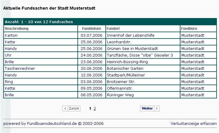 Informationen zum Einbinden der Veröffentlichungsliste finden Sie im Kundenportal von Fundbuerodeutschland. Melden Sie sich dazu mit Ihren Zugangsdaten unter www.Fundbuerodeutschland.de an und wechseln Sie in den Bereich [Homepage]. Neben der Veröffentlichungsliste stehen Ihnen noch weitere Online-Formulare wie die Online-Suche zur Verfügung. Nachfolgend sehen Sie ein Beispiel einer Veröffentlichungsliste für Ihre Homepage. Der Bürger bekommt eine Übersicht der aktuellen Fundsachen von Ihnen angezeigt. Die Anzahl der Fundsachen je Seite (hier 10 Meldungen) kann von Ihnen frei gewählt werden.