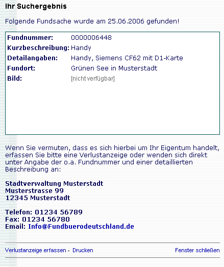 Durch einen Mausklick auf die Beschreibung erhält der Bürger detaillierte Informationen zu einer Fundsache.